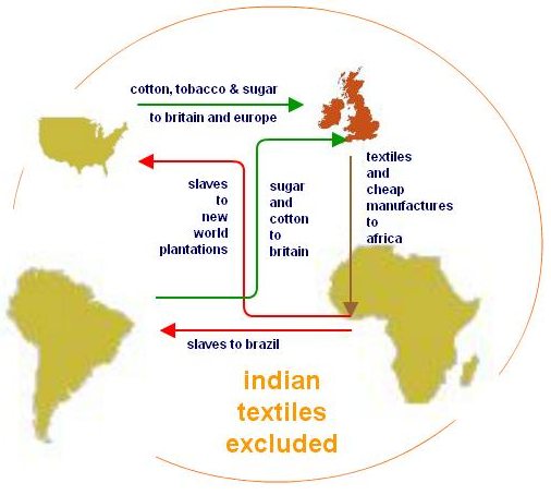 Conditions were grim indeed in the tobacco, sugar and cotton plantations, and in the precious metal mines of the New World that formed an essential part of this trading model. Britain received tobacco, sugar and cotton from slave plantations in Brazil, the American colonies and the Caribbean. The cotton it wove into cheap textiles, which were exported to clothe plantation workers, and help buy slaves from Africa. The slaves were transported to Britain, and thence to plantations, and to mines in Latin America. {3}