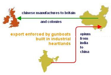 The silver obtained in return from Potosi and the Mexican operations was used to purchase tea, china and silks from China, these being sold to merchants in Britain, Europe and the American colonies. When Chinese demand a century later threatened to empty British banks of silver, the British East India Company promoted the sale of Indian opium to China, overcoming local resistance by wars, which eventually opened up the country to British (and other European) manufactures. The Chinese had no answer to steel-built gunboats that were the products of Industrial Revolution, any more than had the Japanese confronted with Perry's fleet in 1853. {4}